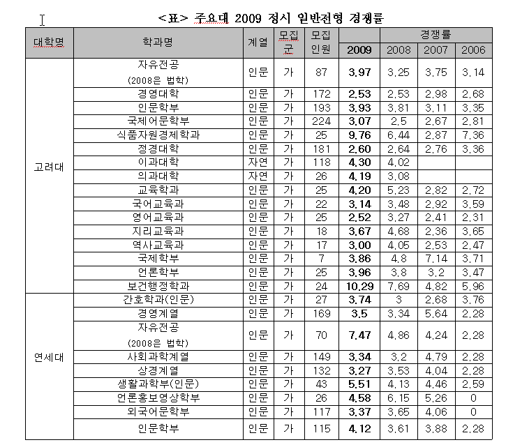 2009 고려대(안암) 정시 경쟁률 현황 분석