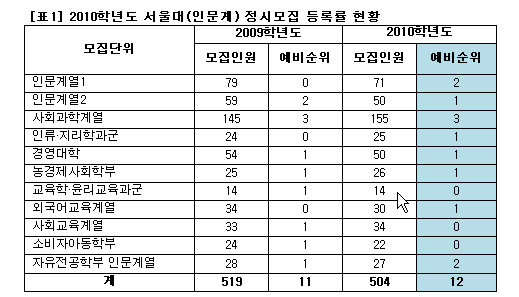 2010 정시 주요 대학별 최초 등록율