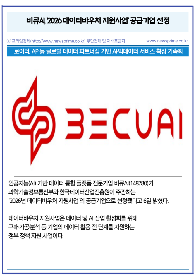 [카드] 비큐AI, '2026 데이터바우처 지원사업' 공급기업 선정
