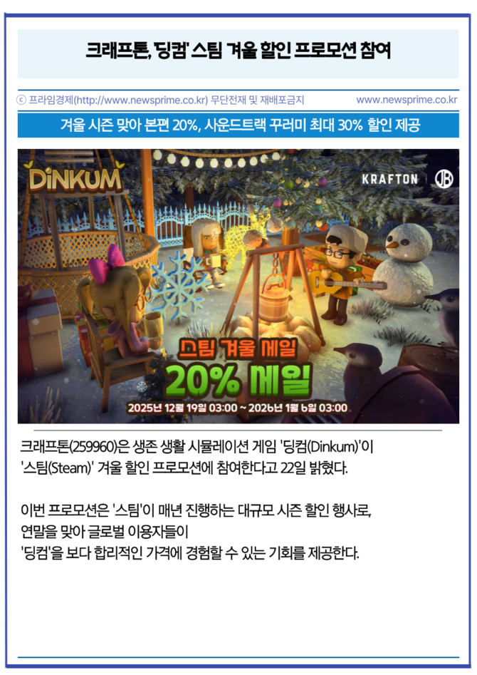 [카드] 크래프톤, '딩컴' 스팀 겨울 할인 프로모션 참여