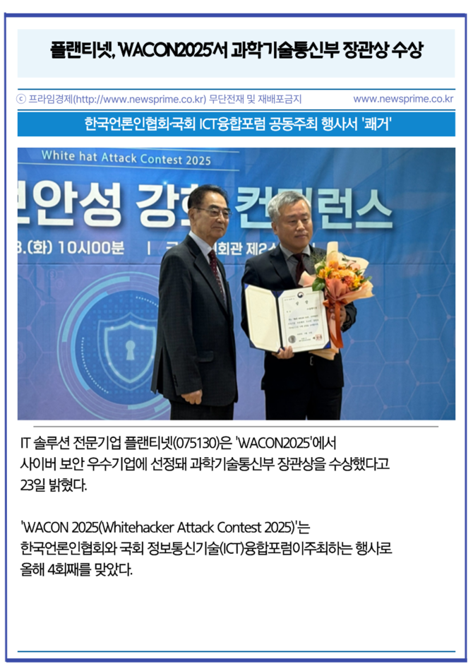[카드] 플랜티넷, 'WACON2025'서 과학기술통신부 장관상 수상