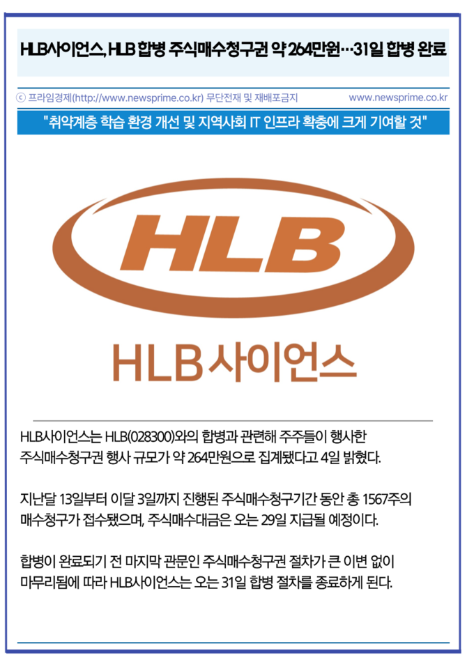 [카드] HLB사이언스, HLB 합병 주식매수청구권 약 264만원…31일 합병 완료