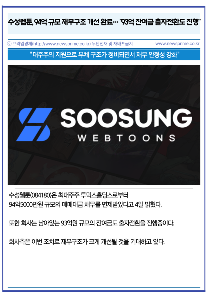 [카드] 수성웹툰, 94억 규모 재무구조 개선 완료…"93억 잔여금 출자전환도 진행"