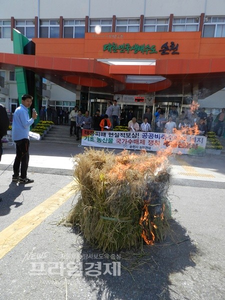 순천농민회, 기초농산물 수매촉구 볏짚 불질러