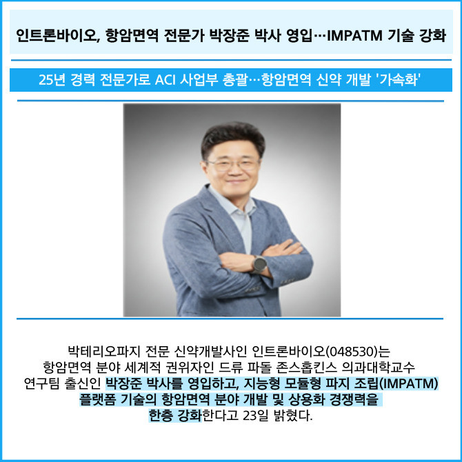 [카드] 인트론바이오, 항암면역 전문가 박장준 박사 영입…IMPATM 기술 강화