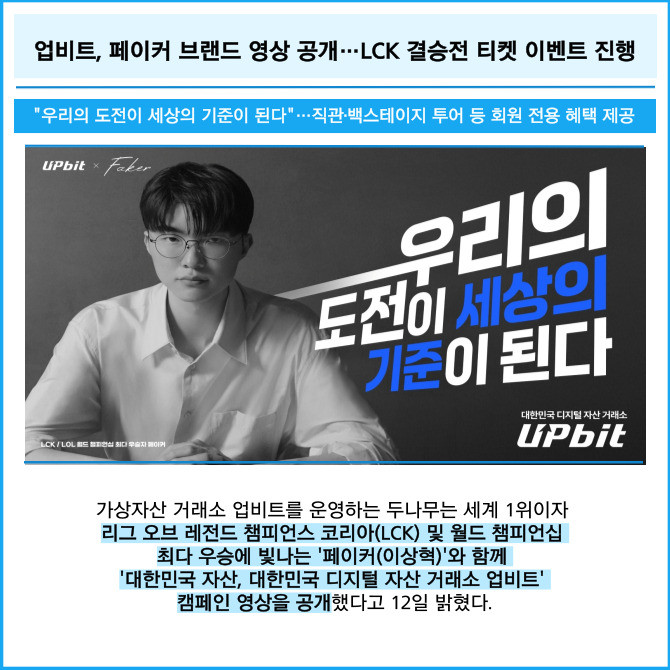 [카드] 업비트, 페이커 브랜드 영상 공개…LCK 결승전 티켓 이벤트 진행