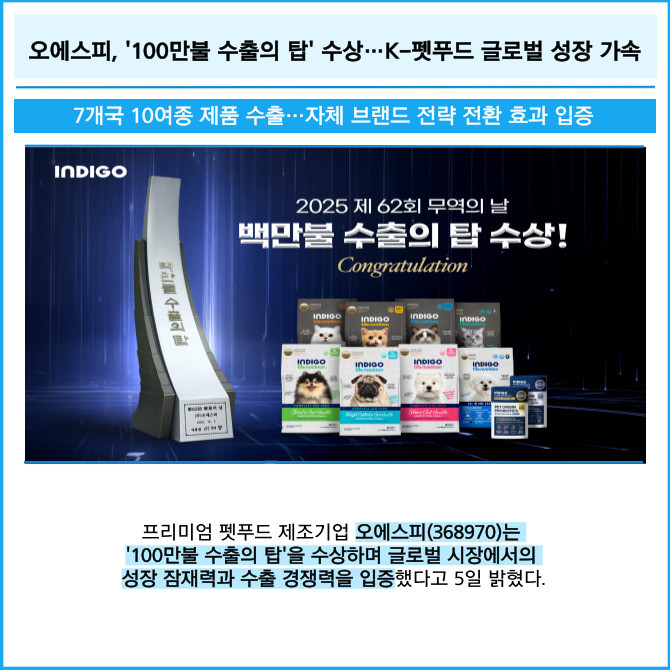 [카드] 오에스피, '100만불 수출의 탑' 수상…K-펫푸드 글로벌 성장 가속