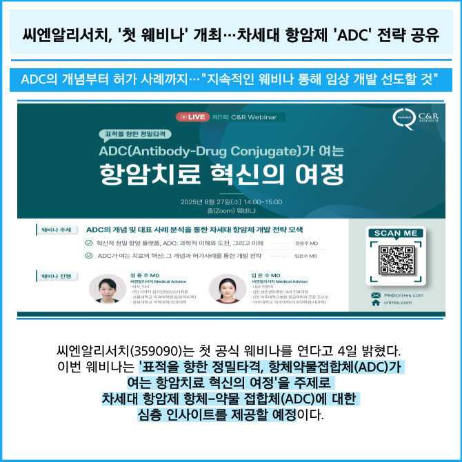 [카드] 씨엔알리서치, '첫 웨비나' 개최…차세대 항암제 'ADC' 전략 공유