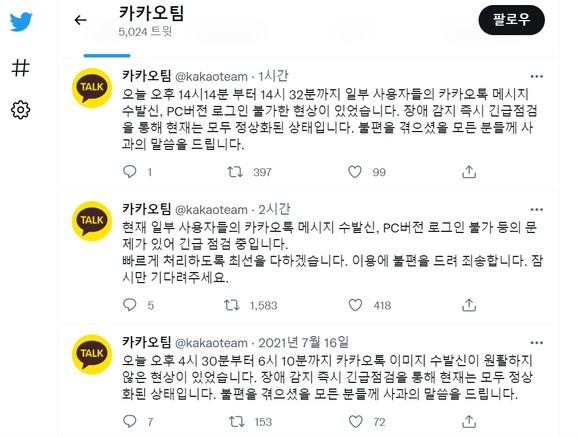 카카오톡 또 '먹통'…20여분 만에 정상화
