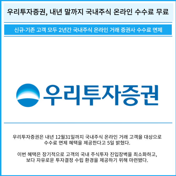[카드] 우리투자증권, 내년 말까지 국내주식 온라인 수수료 무료