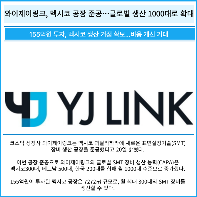 [카드] 와이제이링크, 멕시코 공장 준공…글로벌 생산 1000대로 확대