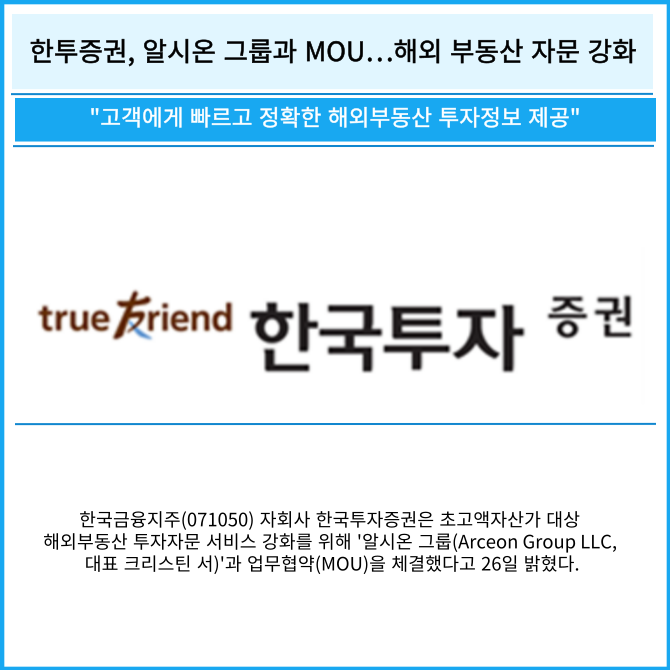 [카드] 한투증권, 알시온 그룹과 MOU…해외 부동산 자문 강화