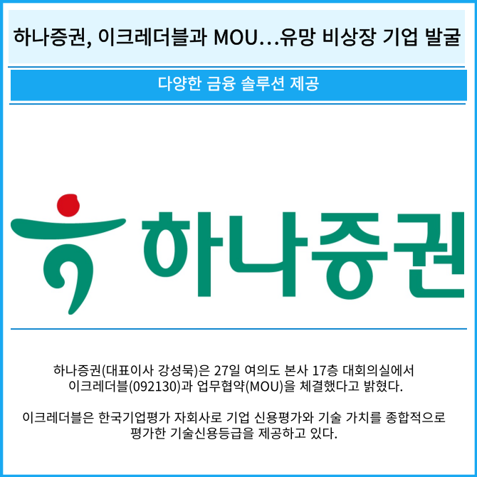 [카드] 하나증권, 이크레더블과 MOU…유망 비상장 기업 발굴