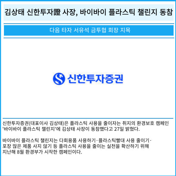 김상태 신한투자證 사장, 바이바이 플라스틱 챌린지 동참