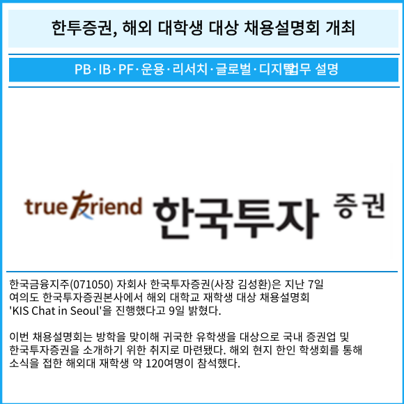 [카드] 한투증권, 해외 대학생 대상 채용설명회 개최