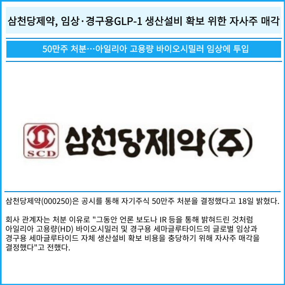 [카드] 삼천당제약, 임상·경구용 GLP-1 생산설비 확보 위한 자사주 매각