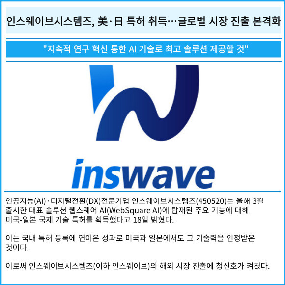 [카드] 인스웨이브시스템즈, 美·日 특허 취득…글로벌 시장 진출 '본격화'