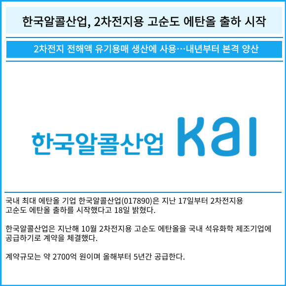 [카드] 한국알콜산업, 2차전지용 고순도 에탄올 출하 시작