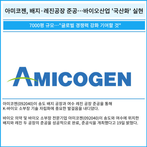 [카드] 아미코젠, 배지·레진 공장 준공…바이오산업 '국산화' 실현