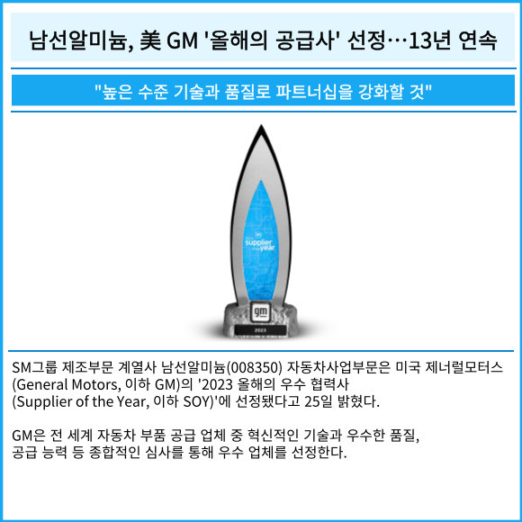 [카드] 남선알미늄, 美 GM '올해의 공급사' 선정…13년 연속