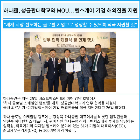 [카드] 하나證, 성균관대와 MOU…헬스케어 기업 해외진출 지원