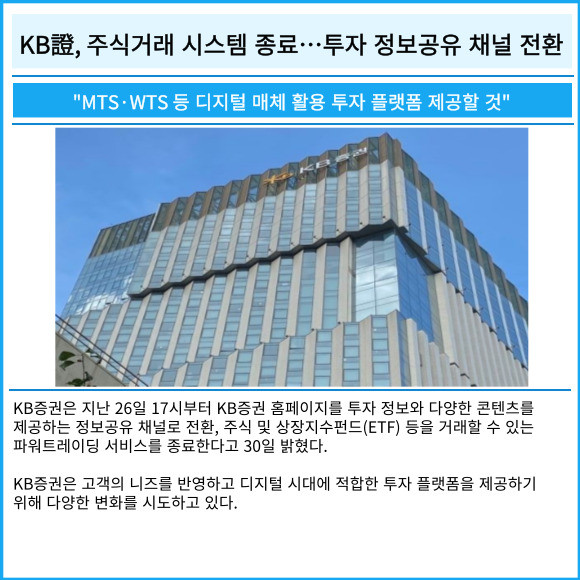 [카드] KB證, 주식거래 시스템 종료…투자 정보공유 채널 전환