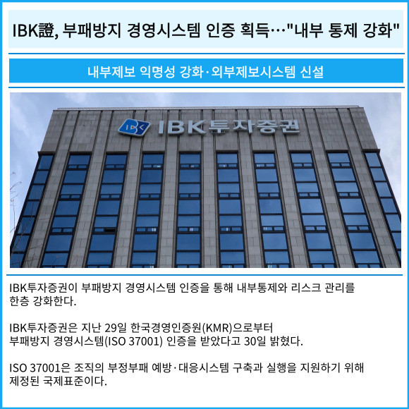 [카드] IBK證, 부패방지 경영시스템 인증 획득…"내부 통제 강화"
