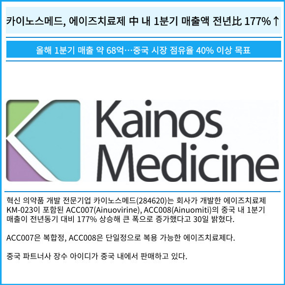 [카드] 카이노스메드, 에이즈치료제 中 내 1분기 매출액 전년比 177%↑