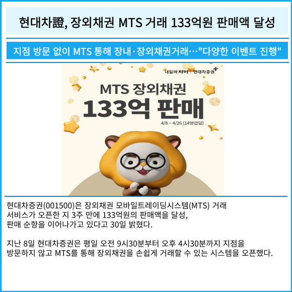 [카드] 현대차證, 장외채권 MTS 거래 133억원 판매액 달성