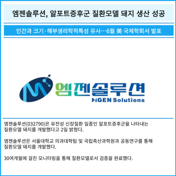 [카드] 엠젠솔루션, 알포트증후군 질환모델 돼지 생산