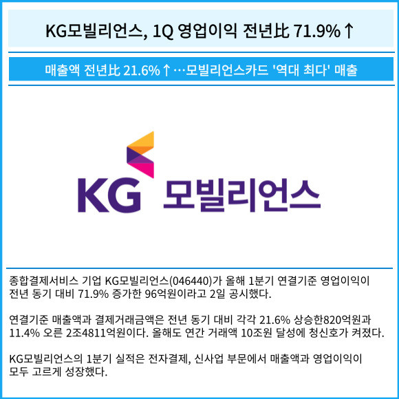[카드] KG모빌리언스, 1Q 영업이익 전년比 71.9%↑