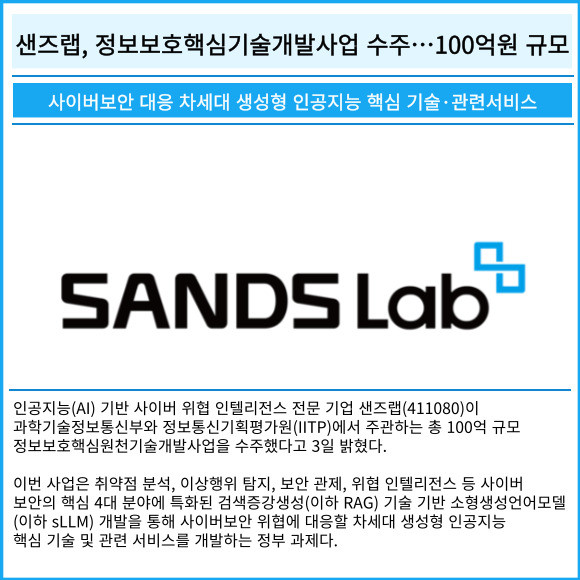 [카드] 샌즈랩, 정보보호핵심기술개발사업 수주…100억원 규모