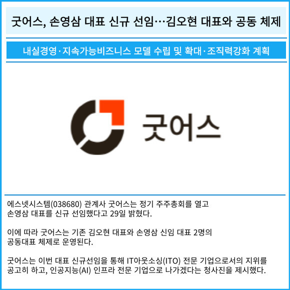[카드] 굿어스, 손영삼 대표 신규 선임…김오현 대표와 공동 체제