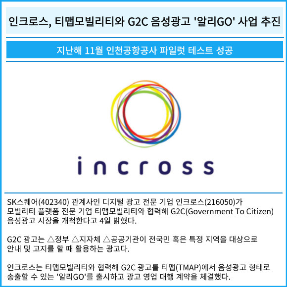 [카드] 인크로스, 티맵모빌리티와 G2C 음성광고 '알리GO' 사업 추진