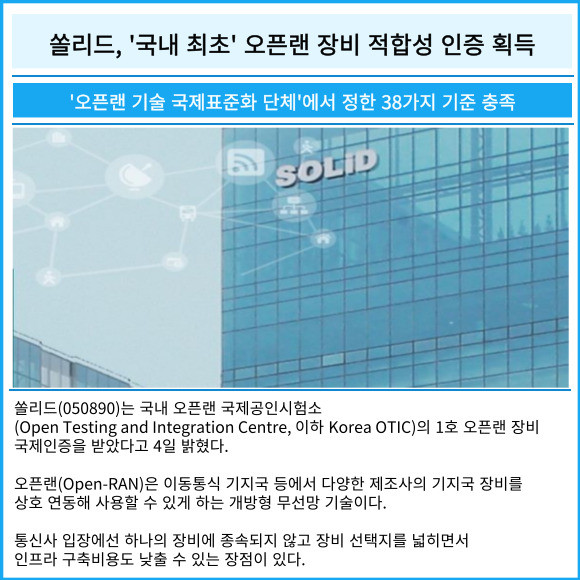 [카드] 쏠리드, '국내 최초' 오픈랜 장비 적합성 인증 획득