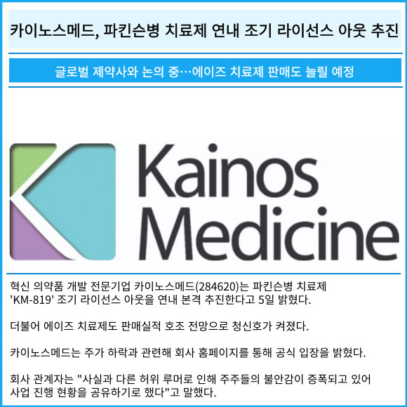 [카드] 카이노스메드, 파킨슨병 치료제 연내 조기 라이선스 아웃 추진