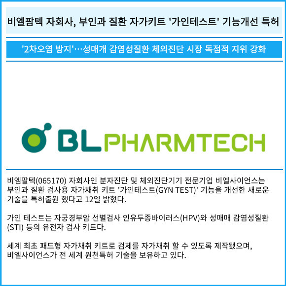 [카드] 비엘팜텍 자회사, 부인과 질환 자가키트 '가인테스트' 기능개선 특허
