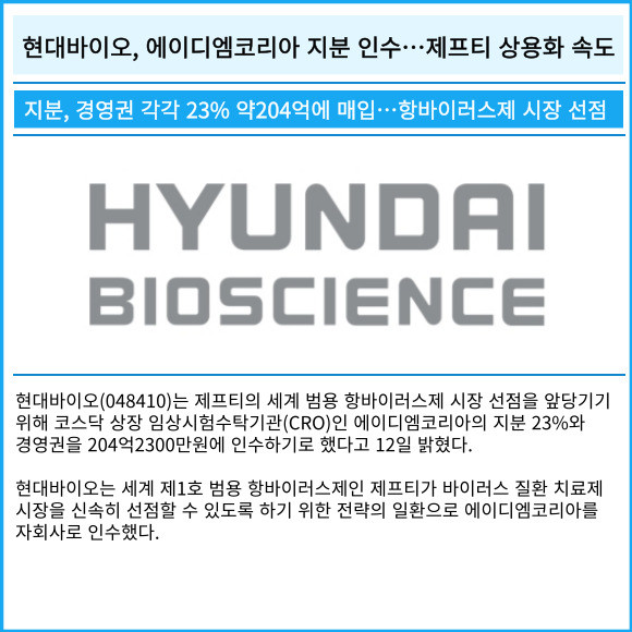 [카드] 현대바이오, 에이디엠코리아 지분 인수…제프티 상용화 속도
