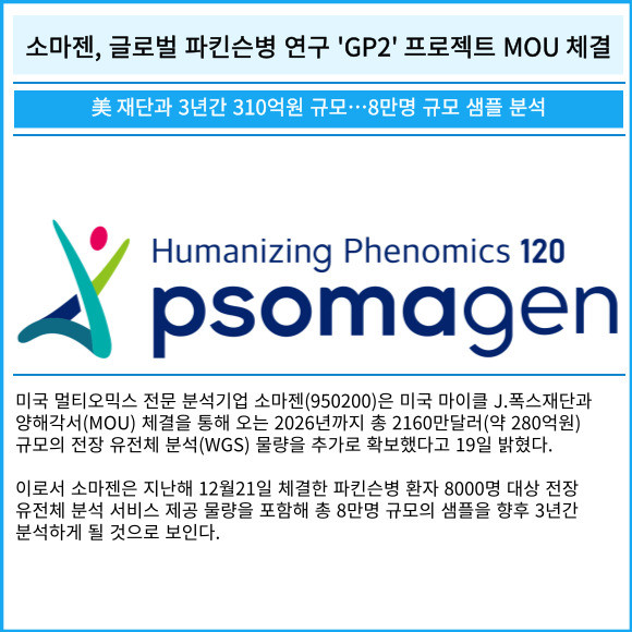 [카드] 소마젠, 글로벌 파킨슨병 연구 'GP2' 프로젝트 MOU 체결