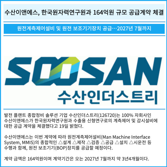 [카드] 수산이앤에스, 한국원자력연구원과 164억원 규모 공급계약 체결