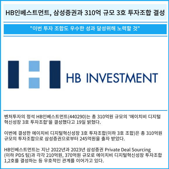 [카드] HB인베스트먼트, 삼성증권과 310억 규모 3호 투자조합 결성