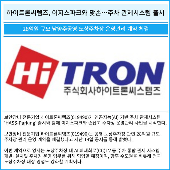 [카드] 하이트론씨템즈, 이지스파크와 맞손…주차 관제시스템 출시