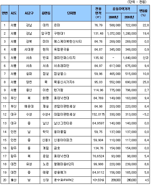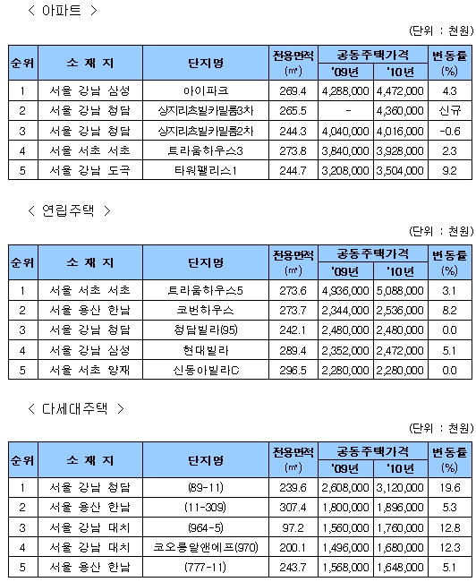 <표>2010년 전국 개별주택가격 상위 5위 현황