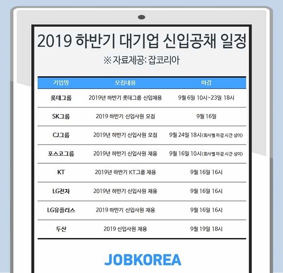 잡코리아, 2019 하반기 대기업 신입공채 일정 발표