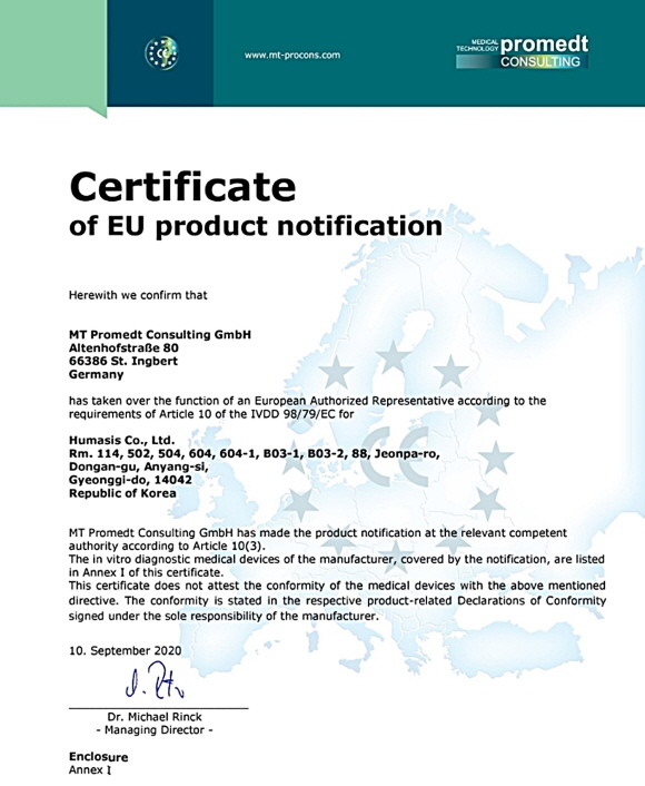 휴마시스, 코로나19 항원 진단키트 유럽 CE-IVD 인증 획득