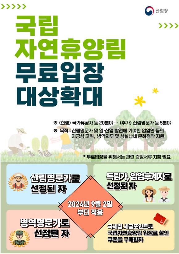 산림청, 국립자연휴양림 입장료 면제 대상 확대