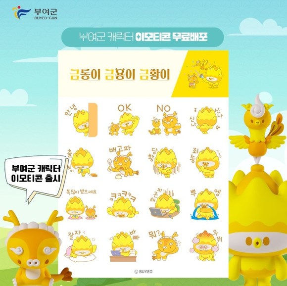 부여군 신규 캐릭터 '금동이·금용이·금황이' 이모티콘 무료 배포