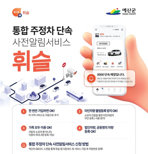 예산군 통합 불법 주·정차 단속 사전 알림서비스 '휘슬' 개시