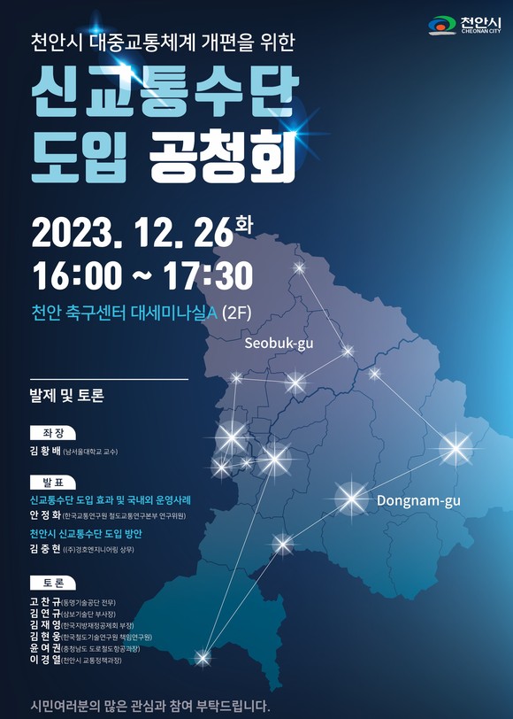 천안시, 천안축구센터서 신교통수단 도입 전략 공청회 개최 예정