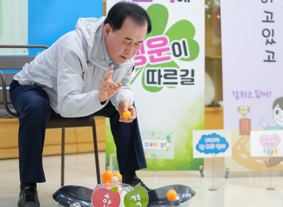 김지철 충남교육감, 탁구공으로 합격 향해 '골인' 이색 수능 응원 화제